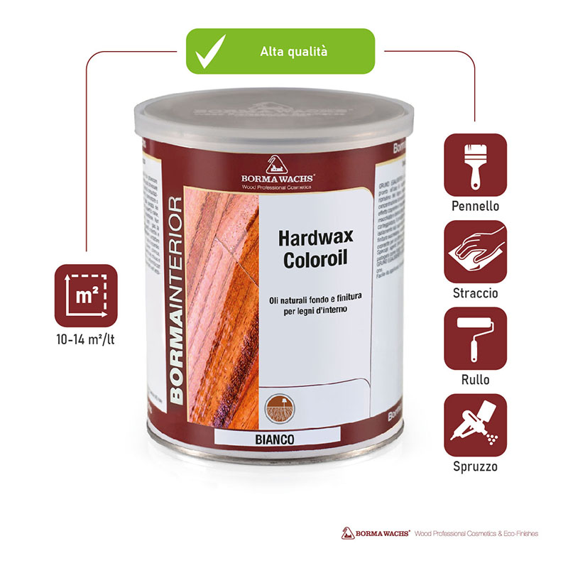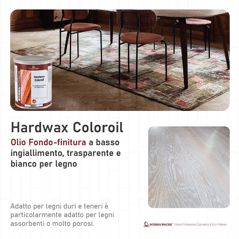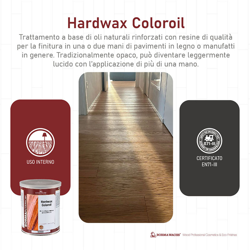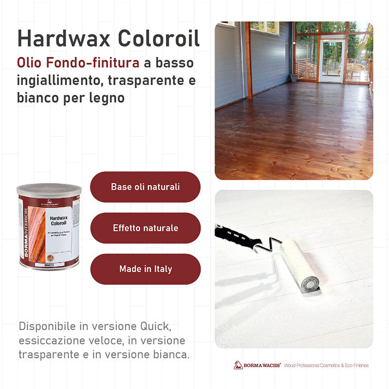 Trattamento a base di oli naturali rinforzati con resine di qualità per la finitura in una o due mani di pavimenti in legno. Adatto per legni duri e teneri. Particolarmente adatto per legni assorbenti o molto porosi. Disponibile in versione Quick, essiccazione veloce. L'aggiunta di speciali cere permette di ottenere superfici ad effetto naturale ma con maggiore morbidezza al tatto e una maggiore opacità. Tradizionalmente opaco, può diventare leggermente lucido con l'applicazione di più di una mano. Bianco è ottimo per le finiture ad olio in cui è desiderata un'intensa colorazione e una bassa ossidazione nel tempo, trasparente è l'ideale per proteggere lo strato di bianco da graffi e sporco.