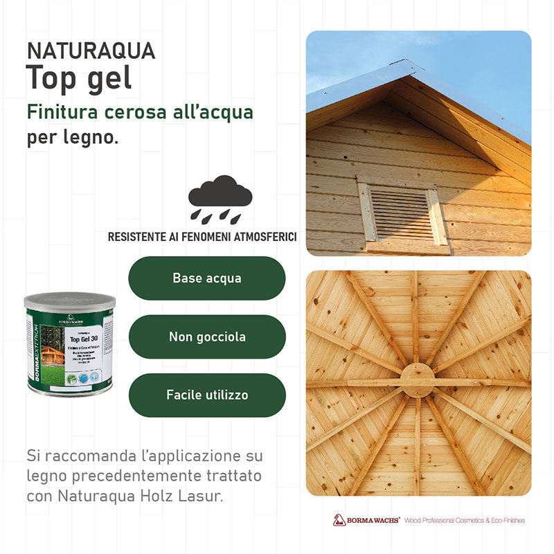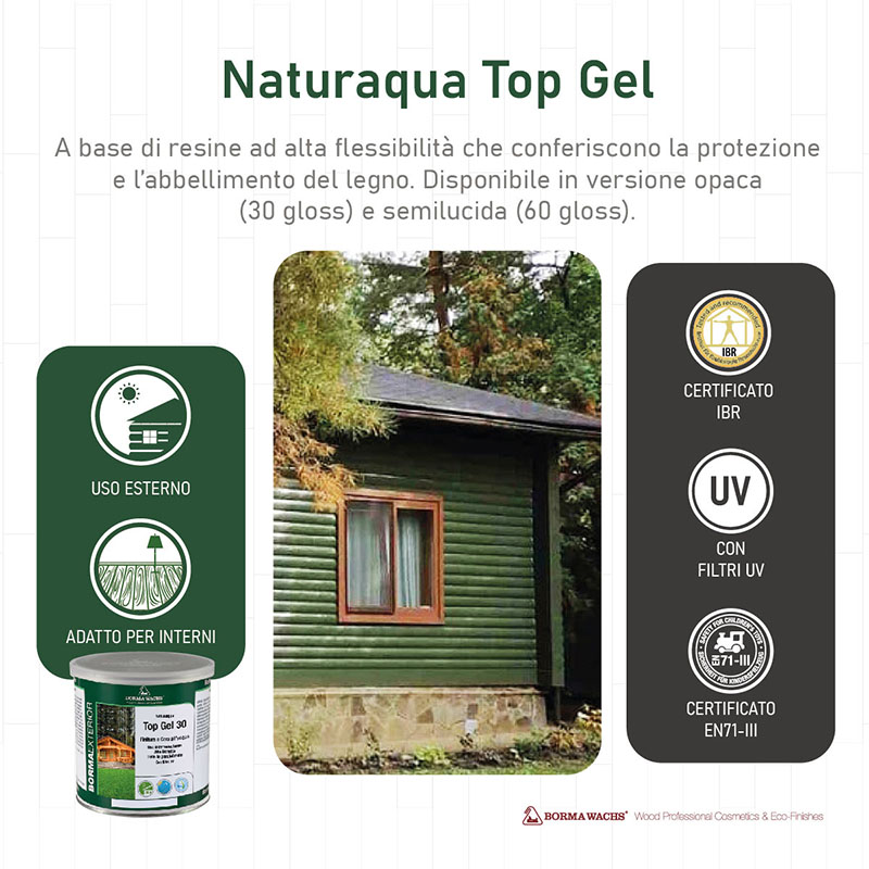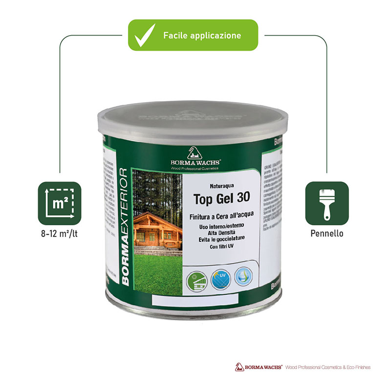 Finitura incolore non sfogliante all’acqua per legno, a base di resine ad alta flessibilità per la protezione e l’abbellimento del legno. Resa: 8 - 12 m²/Lt Temperatura di utilizzo: + 5°C/ + 30°C Uso: Interno/Esterno Con filtri UV. Le preziose sostanze che lo compongono abbinate ai filtri UV, impediscono il formarsi di muffe cromofore e prevengono l’attacco degli insetti lignivori, garantendo un’ottima resistenza agli agenti atmosferici. La sua naturale densità facilita le applicazioni a pennello. Non contiene Lindane e PCP
