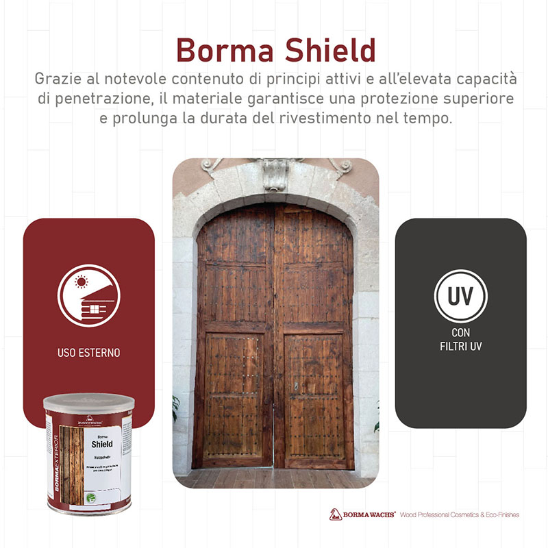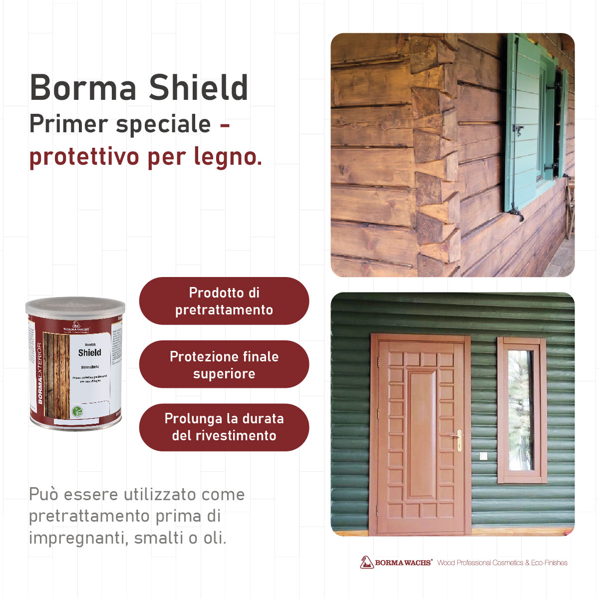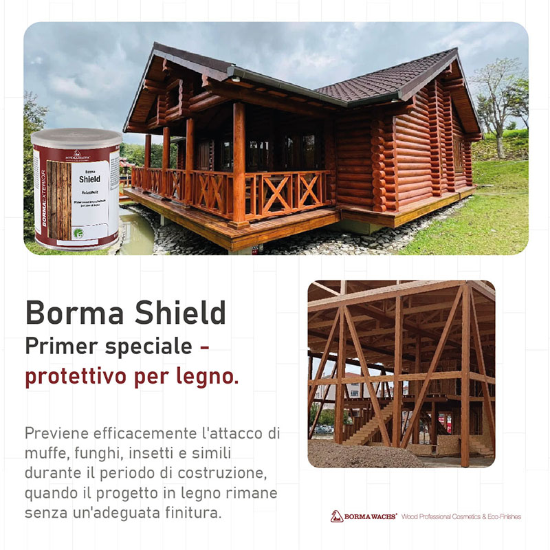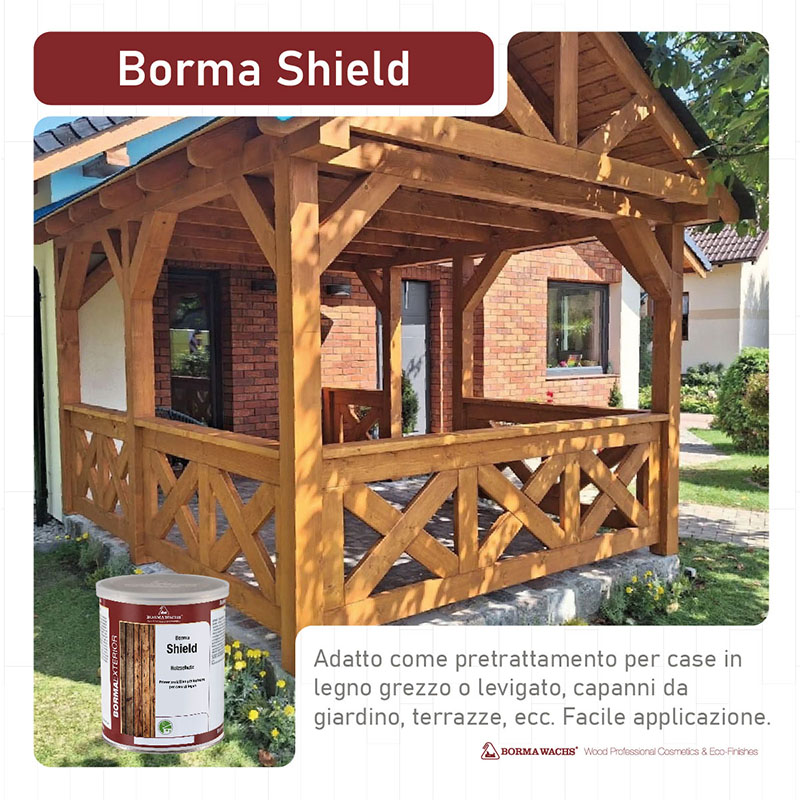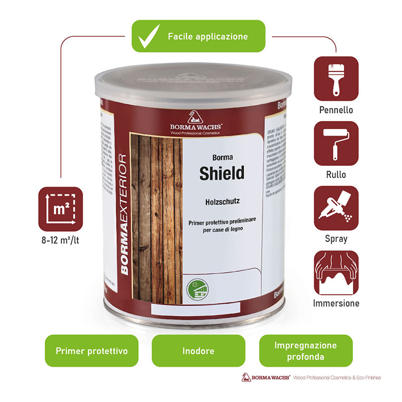 Su case o altri manufatti di recente costruzione, applicare una singola mano di Borma Shield sul legno fresco. Sono consentite tutte le tecniche di applicazione, ma quella a pennello èpreferibile. Il prodotto ha un'eccellente capacità di penetrazione e protegge il legno in profondità; basta assicurarsi di stendere uniformemente sull'intera superficie. Qualora il legno fosse di conifera, la resina naturale che lo caratterizza non causerà alcun problema al prodotto, che penetrerà ugualmente.