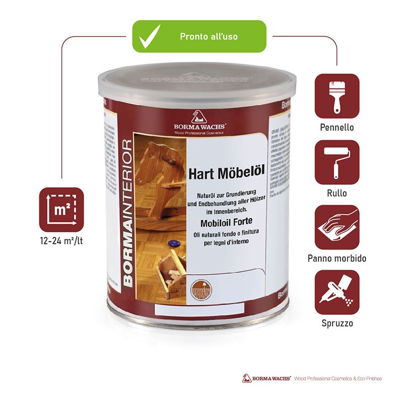 Di notevole morbidezza, ha un’ottima resistenza all’acqua. Di facilissima applicazione è perfetto per la manutenzione ordinaria e straordinaria delle superfici trattate ad olio. Adatto per legni duri e teneri. Particolarmente adatto per legni assorbenti o molto porosi. Indicato per il trattamento di porte, finestre, battiscopa ed altri oggetti di legno. Solo per interni.