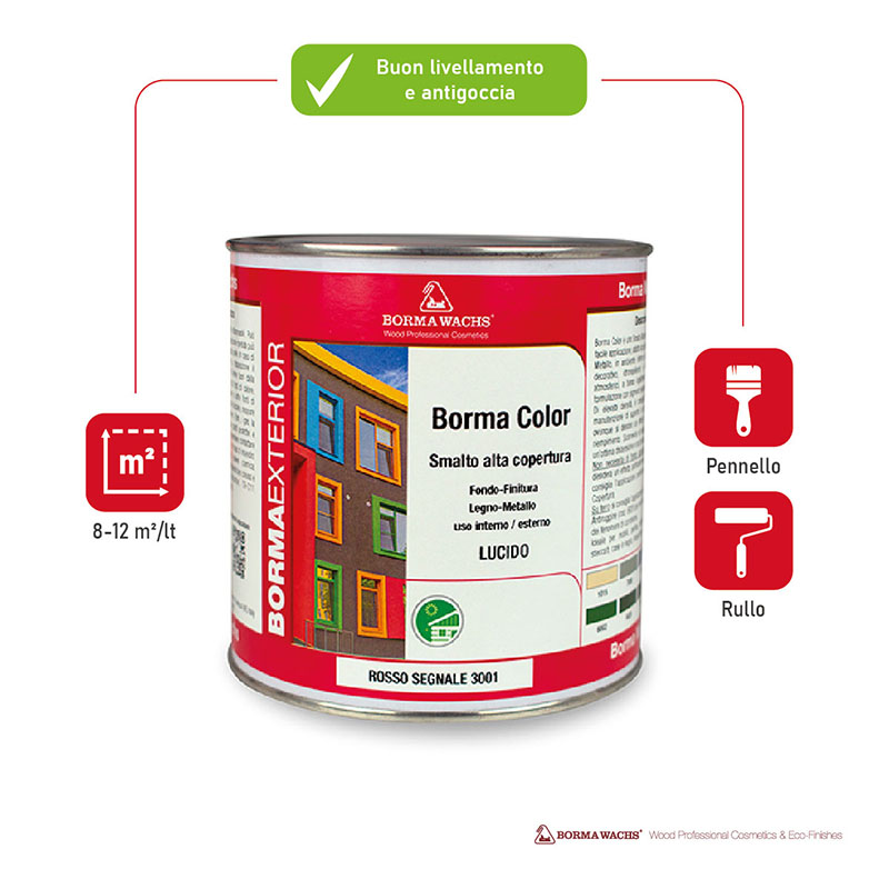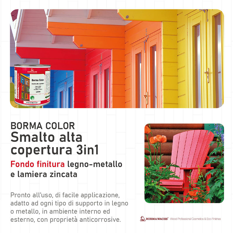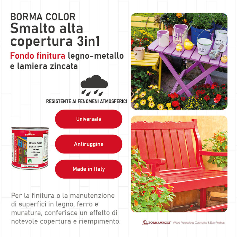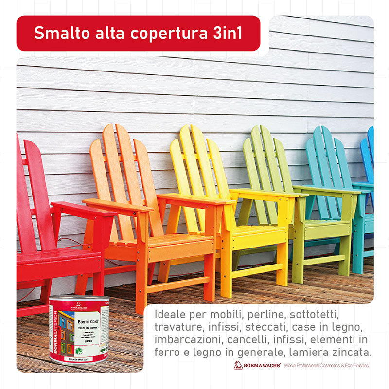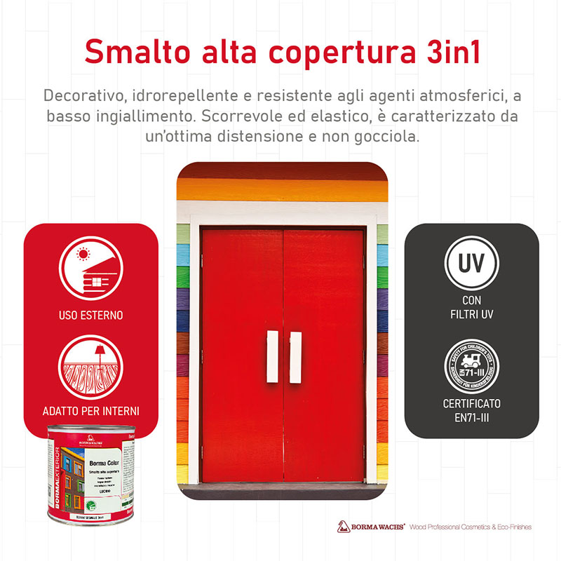 Smalto ad alta copertura pronto all’uso, di facile applicazione, adatto ad ogni tipo di supporto, in ambiente interno ed esterno. Crea un film decorativo, idrorepellente e resistente agli agenti atmosferici, a basso ingiallimento.